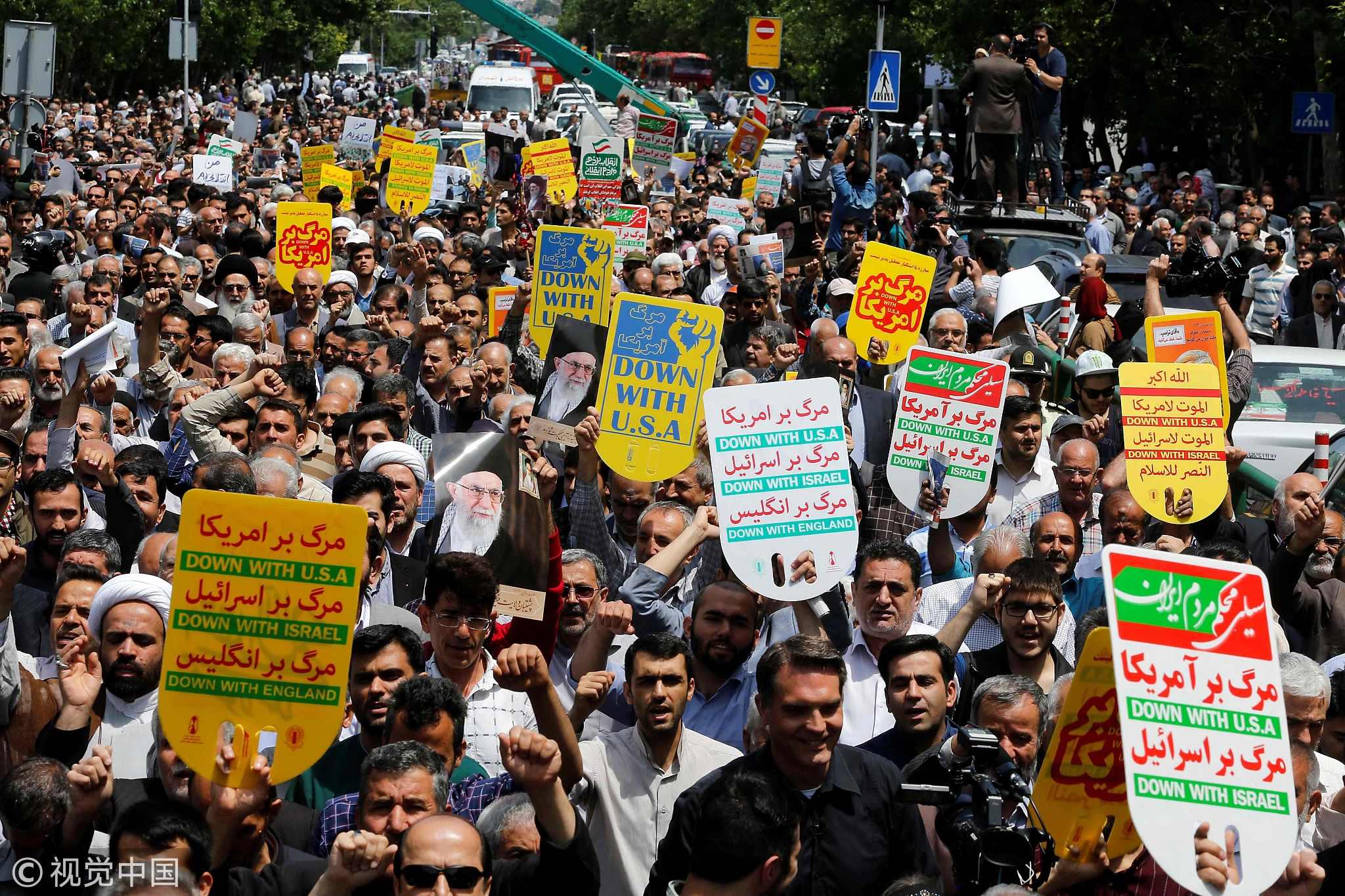 Iranians hold anti-US placards and shout slogans during a demonstration after Friday prayer in the capital Tehran, May 11, 2018. /VCG Photo