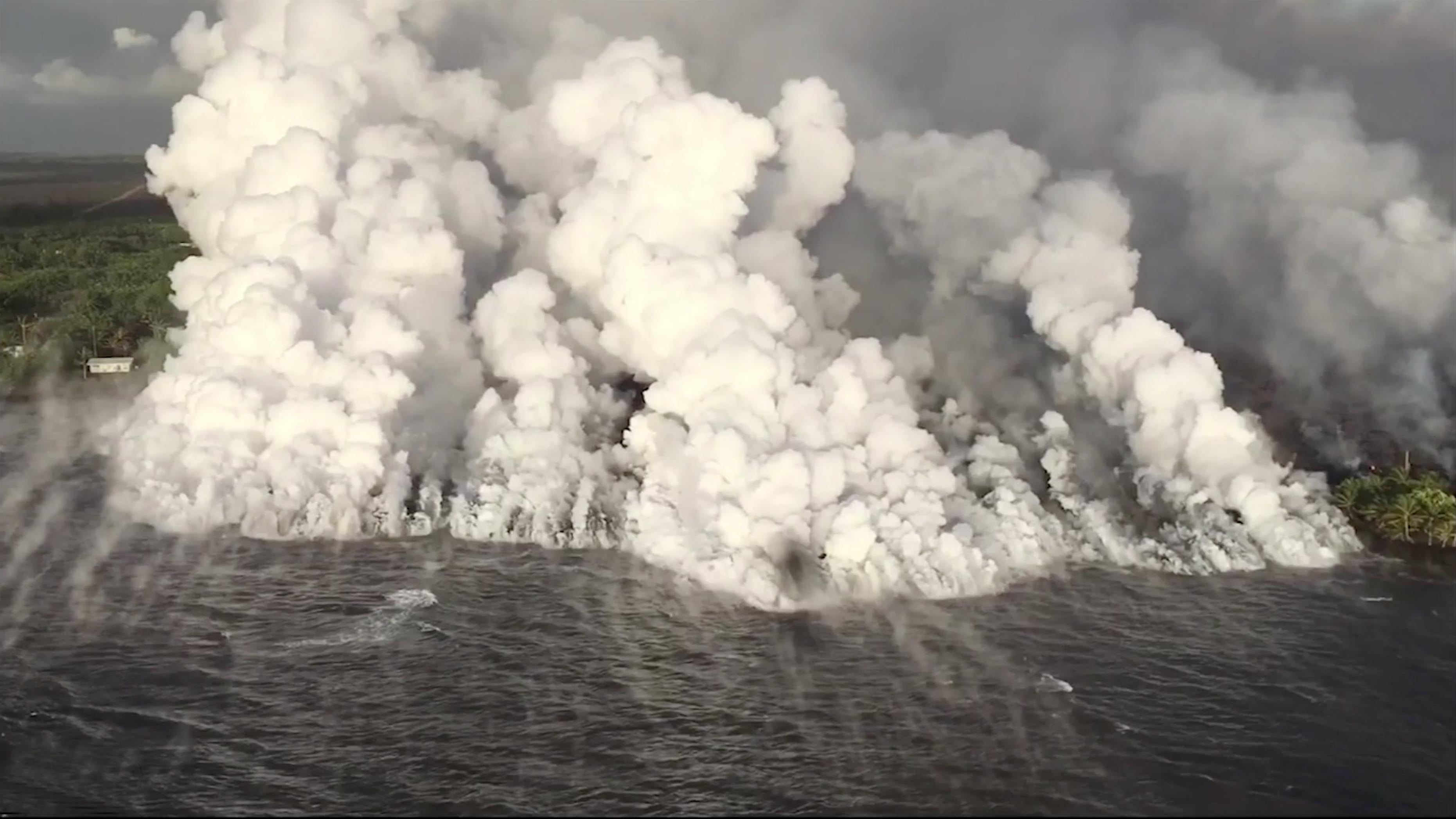 Aerial footage showed lava from one fissure entering the ocean at Kapoho Bay in Hawaii on Monday. A laze plume blew inland from the ocean entry, sending hydrochloric acid and steam with fine glass particles in the air. The smoke can irritate the skin and eyes and cause difficulties in breathing. As of Monday, lava burned down 117 homes.