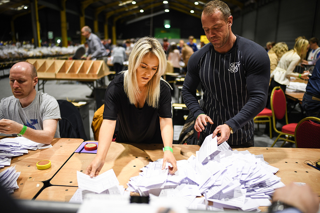 Ballot papers are handled as the count in the Irish abortion referendum at the RDS centre in Dublin, May 26, 2019. /VCG Photo