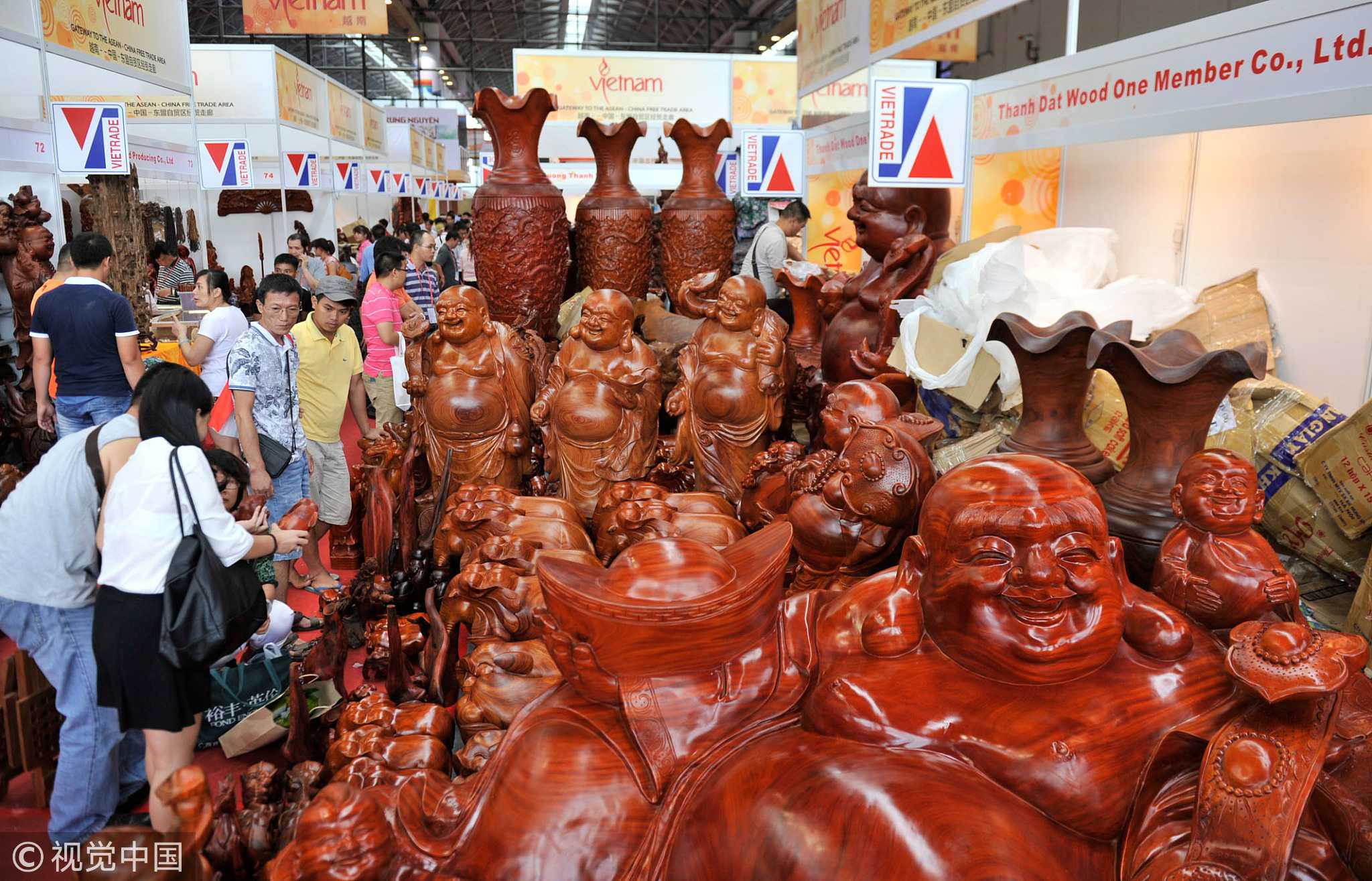 Wood carving sculptures from Vietnam displayed during the 14th CAEXPO. /VCG Photo