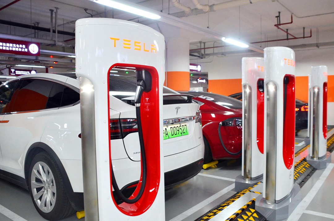 Tesla Inc. electric vehicles are parked at the company's 50-stall charging station that opened in Shanghai on Nov. 22, 2017. /VCG Photo