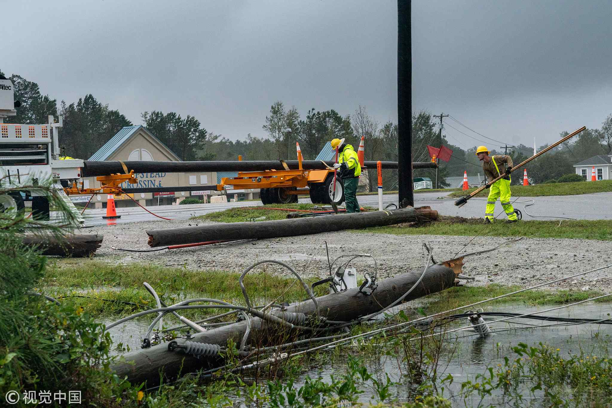 Lonnie Coleman, right, works on replacing a power pole in North Carolina, September 15, 2018. /VCG Photo