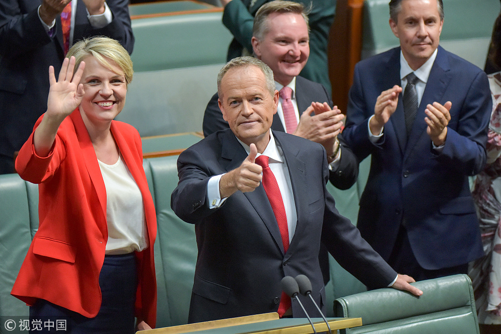 Bill Shorten (C), leader of the Labor Party of Australia, at the end of a budget reply speech in the House of Representatives at Parliament House in Canberra, Australia, April 4, 2019. /VCG Photo