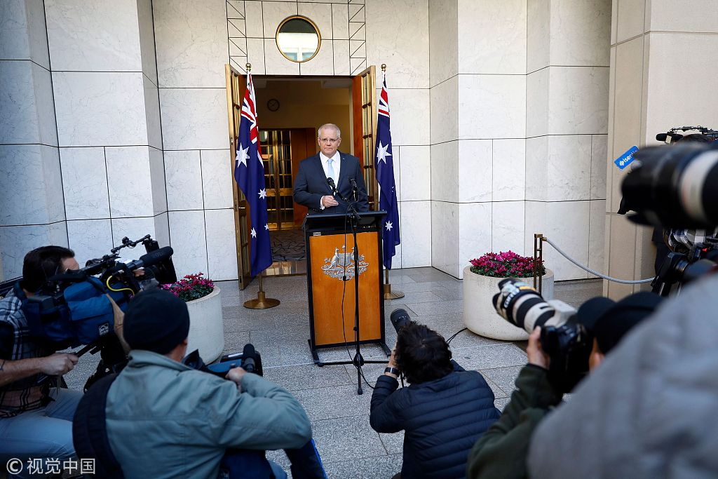 Australia's Prime Minister Scott Morrison speaks at a press conference at the Parliament House in Canberra, April 11, 2019. /VCG Photo