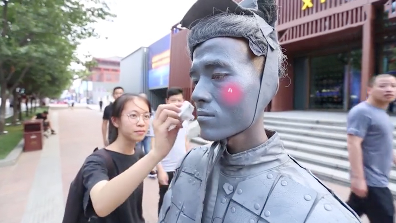 Two men dressed in Terra-cotta Warrior costumes stood sweating at the entrance of Xi'an Art Museum in northwestern China's Shaanxi Province as temperatures reached 34 degrees Celsius. Seeing the sweat on the men's faces two girls helped them wipe it off.