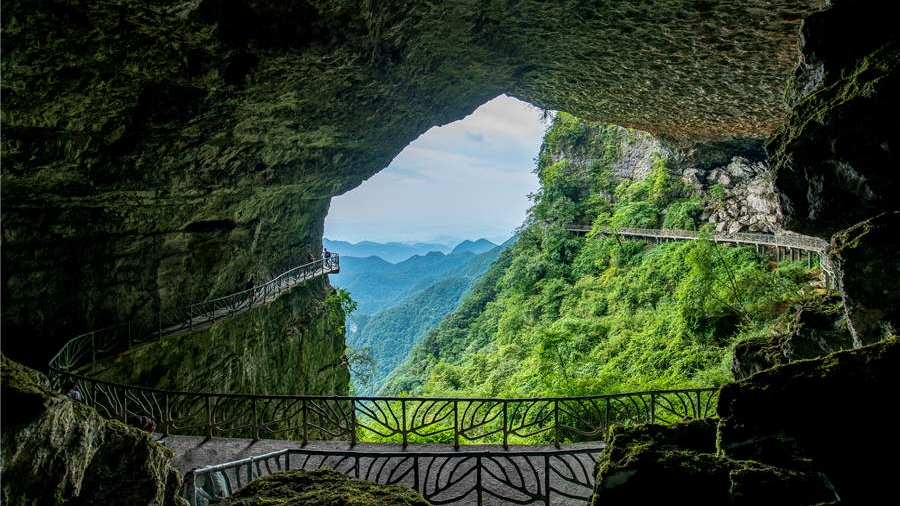A walkway circles the interior of a cave at Jinfo Mountain in Chongqing. /CD Photo
