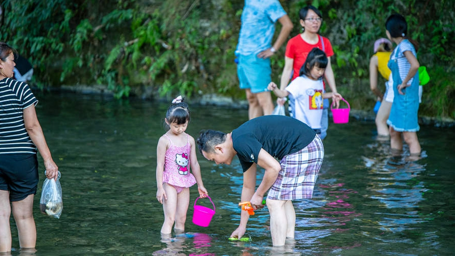 Tourists catch fish and crab at the Jinfo Mountain Scenic Area in Chongqing. /CD Photo