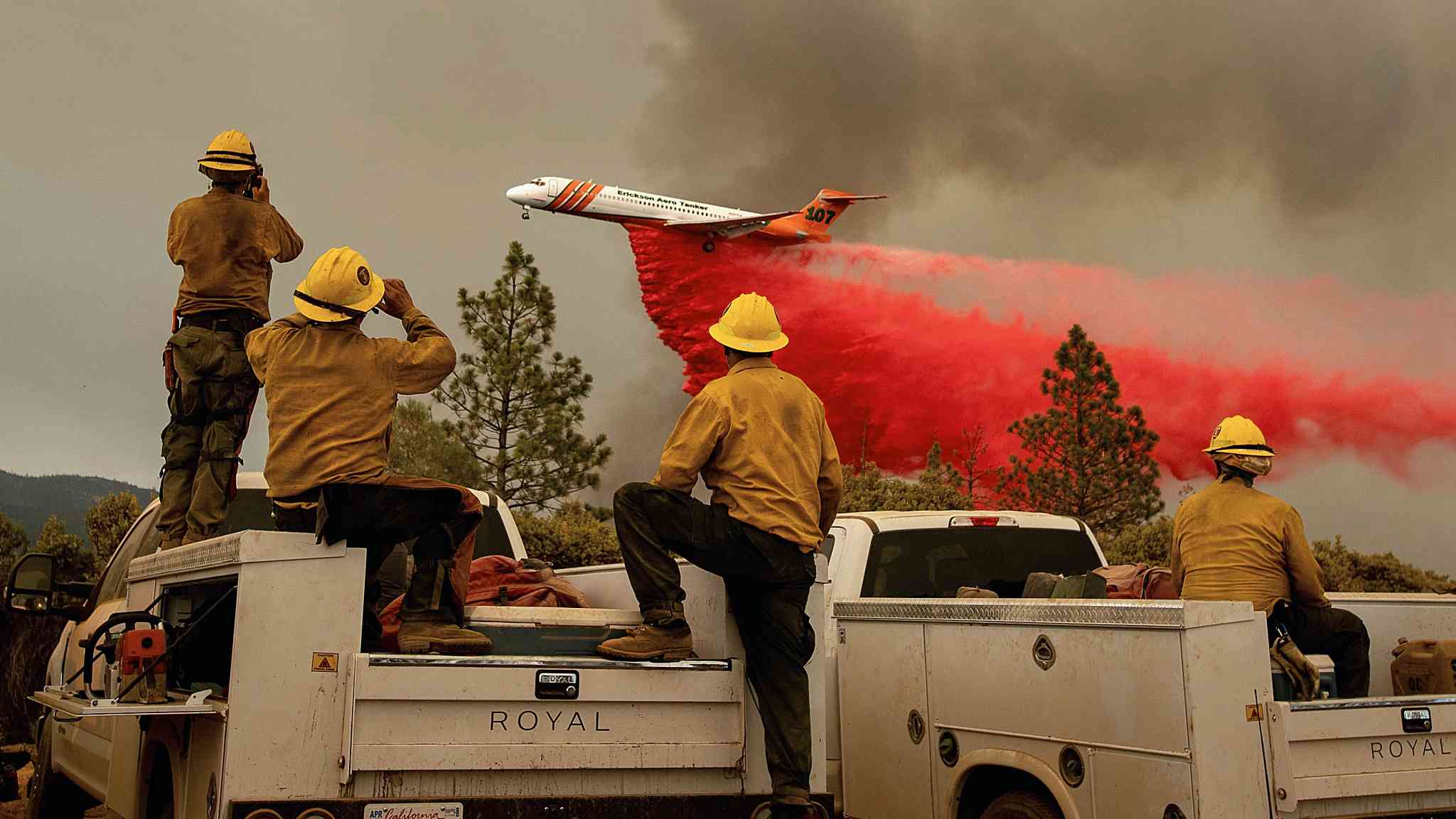 An air tanker dropped retardant to battle the Ferguson fire in the Stanislaus National Forest near Yosemite National Park, California on Saturday. /VCG Photo