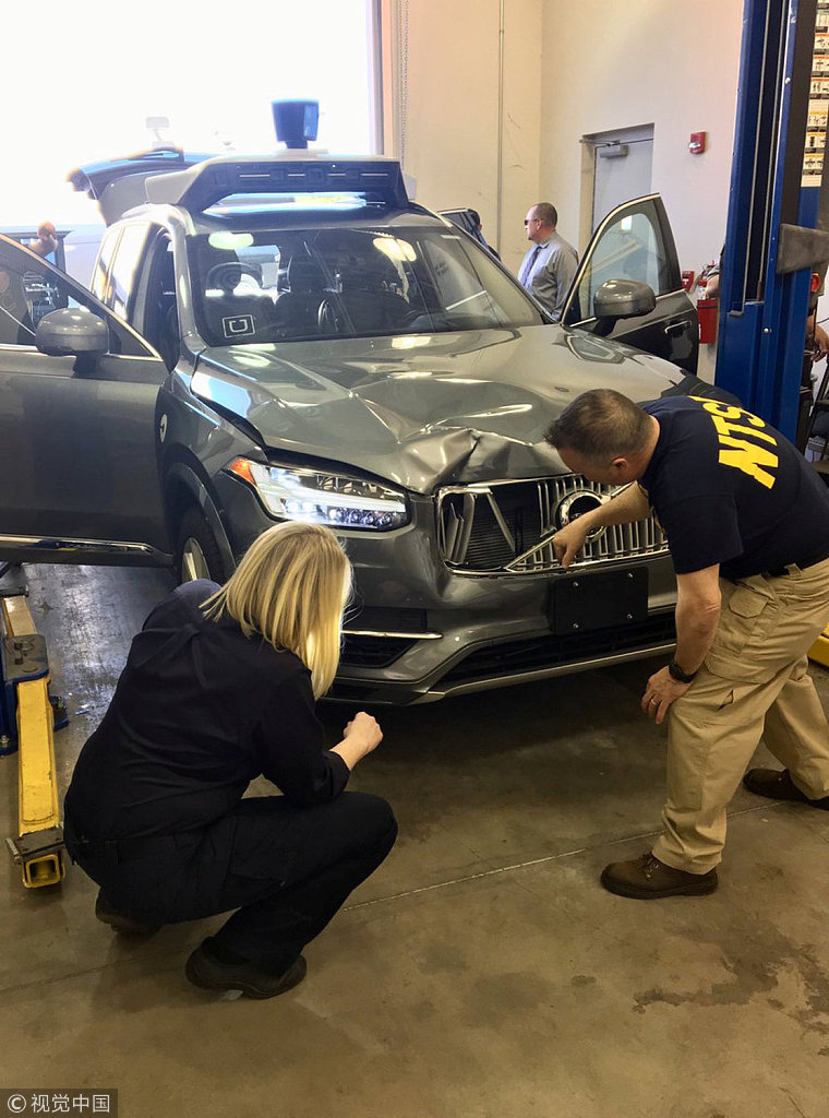 National Transportation Safety Board (NTSB) investigators examine a self-driving Uber vehicle involved in a fatal accident in Tempe, Arizona, U.S., March 20, 2018. /VCG Photo