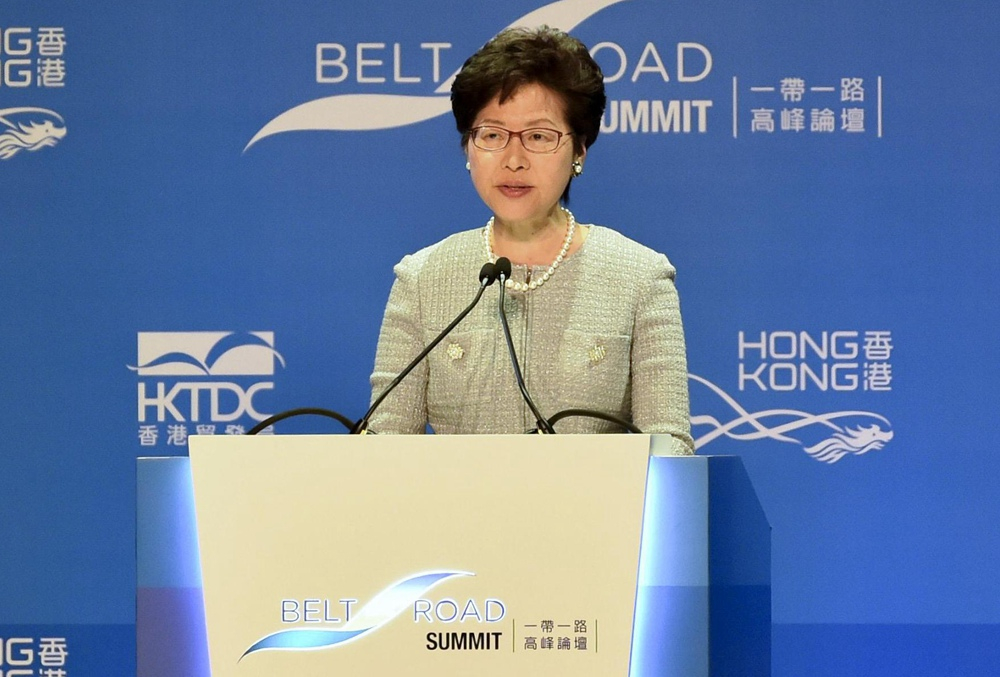 Hong Kong Chief Executive Carrie Lam speaks at a Belt and Road summit in Hong Kong, south China, June 28, 2018. /VCG Photo