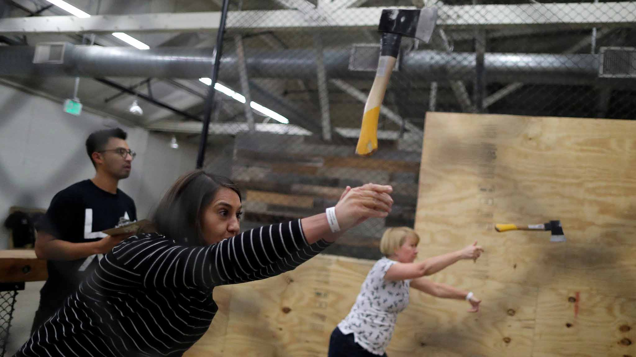 An axe throwing club opened in LA earlier this month. Its operation manager said the activity releases tension at a time when the news can cause people to feel anxiety.