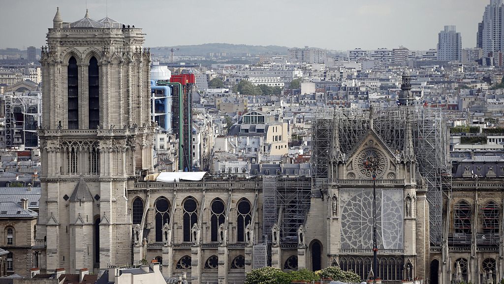 Drone images of the Notre-Dame cathedral, filmed by police, show the severe damage to the burned-out 850-year-old structure. Tarpaulins are being used to protect its interior from rain that is forecast.