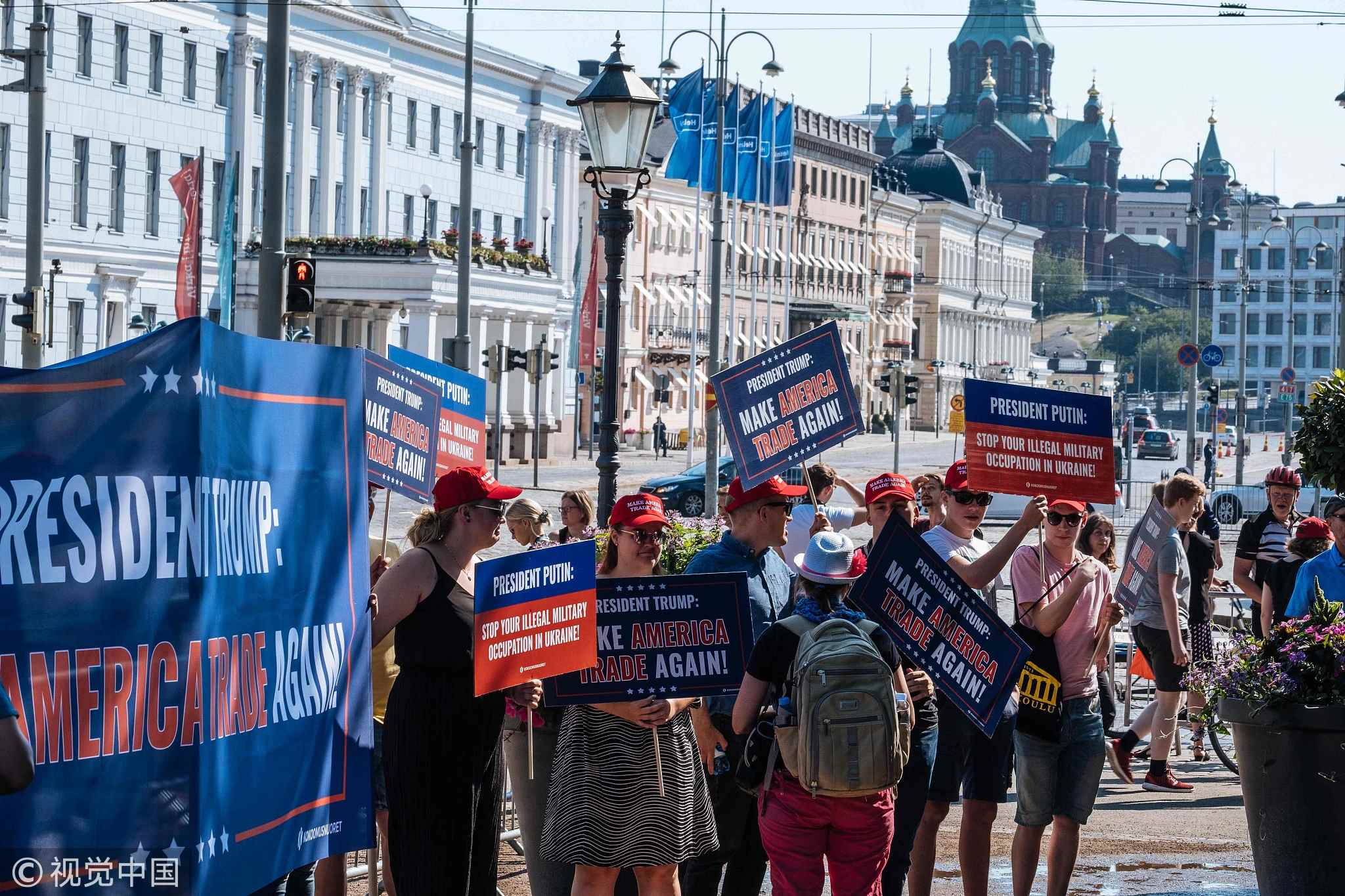 Trump supporters hold banners during a demonstration at the Esplanadi park in Helsinki, Finland, on July 16, 2018, hours ahead of the summit. /VCG Photo