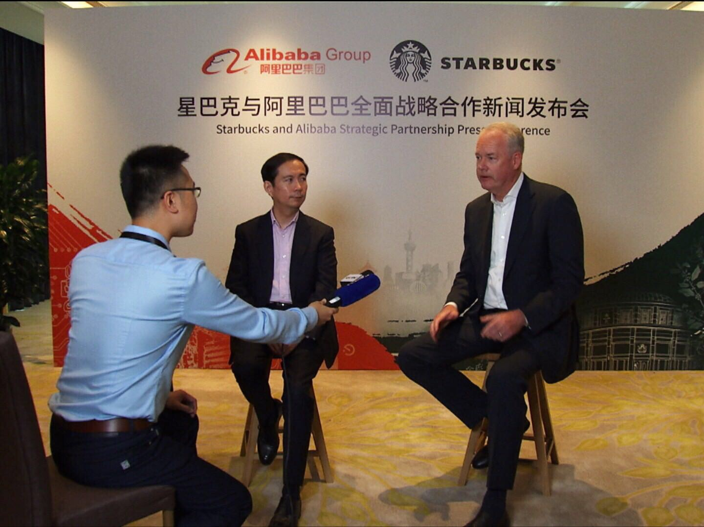Daniel Zhang Yong, CEO of Alibaba (left) and Kevin Johnson, CEO of Starbucks (right), in exclusive interview with CGTN in Shanghai. /CGTN Photo