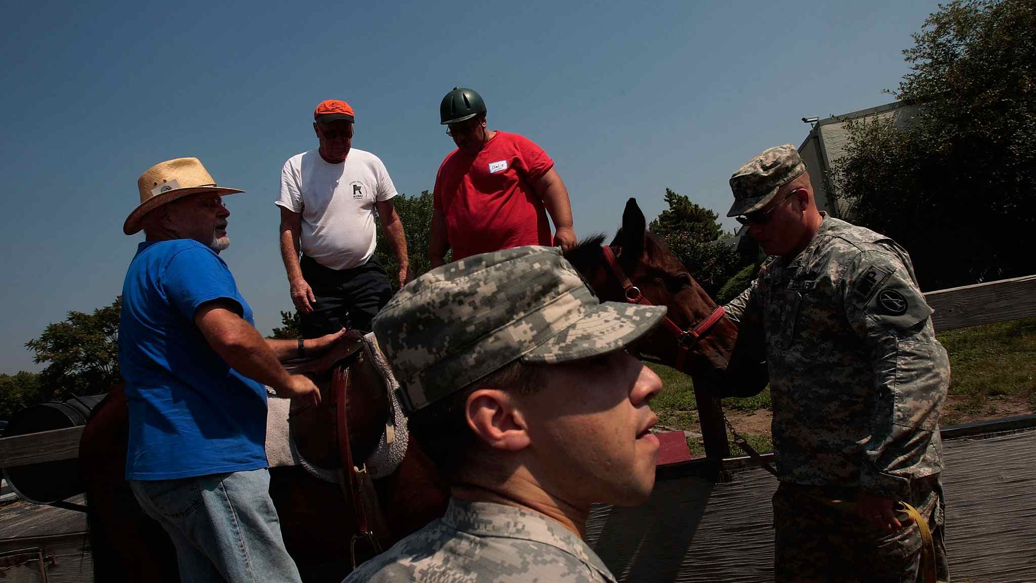(Top Image: The active-duty soldiers come to riding academy frequently to help administer the program for veterans suffering from Post-Traumatic Stress Disorder, giving them horses to ride and care for as a means of treatment for their PTSD.)