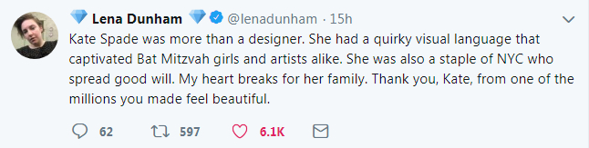 “Kate Spade was more than a designer. She had a quirky visual language that captivated Bat Mitzvah girls and artists alike. She was also a staple of NYC who spread goodwill. My heart breaks for her family. Thank you, Kate, from one of the millions you made feel beautiful.” – Lena Dunham, via Twitter.