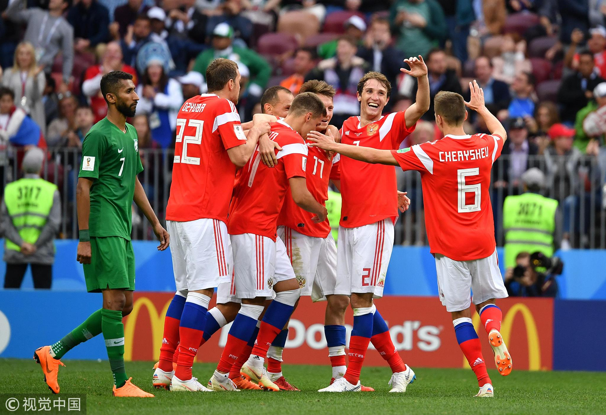Russian players are celebrating the goal against Saudi Arabia for the World Cup at Luzhniki Stadium in Moscow, Jun 14, 2018./VCG Photo