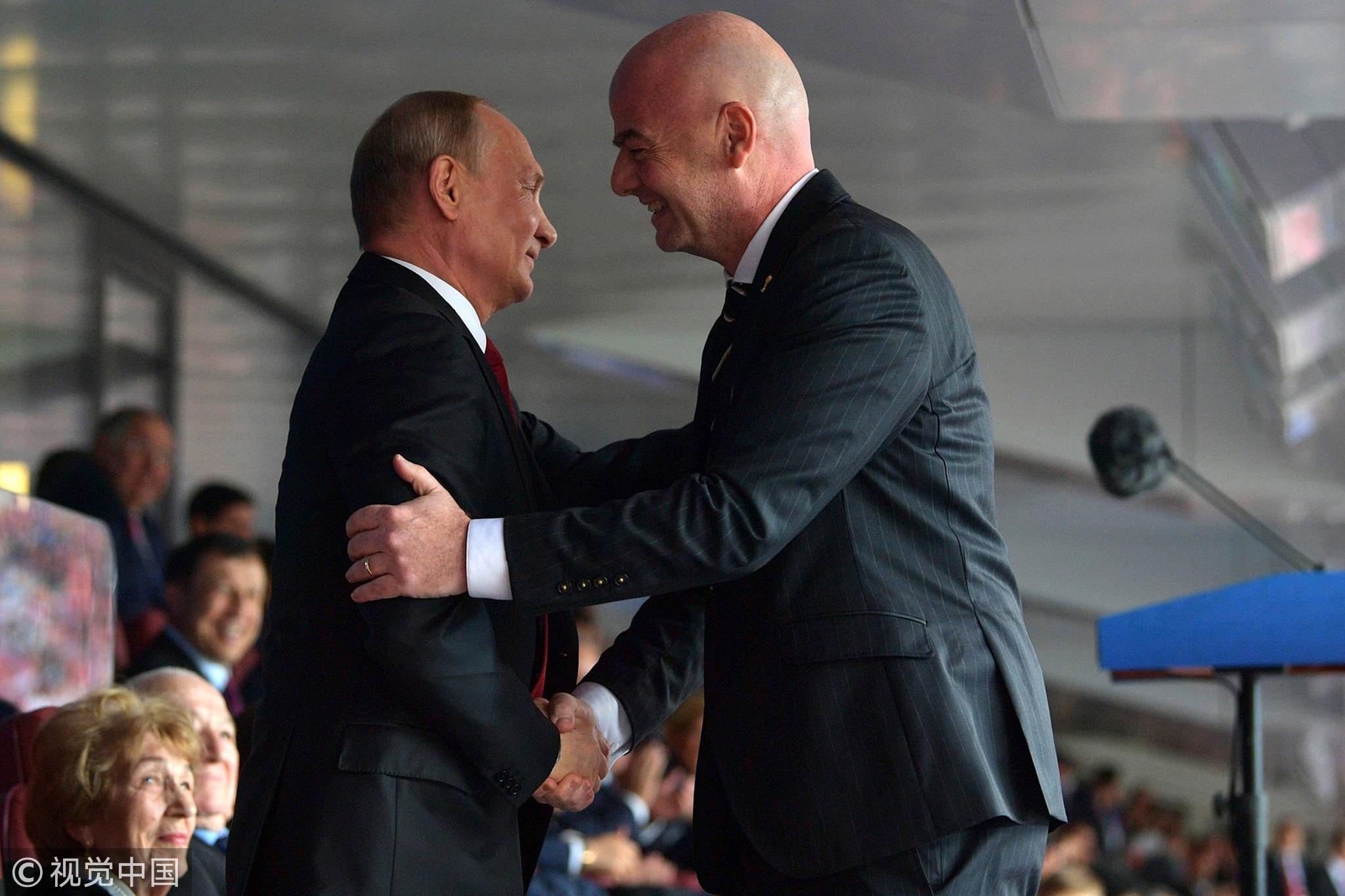 Russian President Vladimir Putin (L) and FIFA President Gianni Infantino shake hands during the opening ceremony prior to the 2018 FIFA World Cup Russia Group A match between Russia and Saudi Arabia at Luzhniki Stadium in Moscow, June 14, 2018./VCG Photo