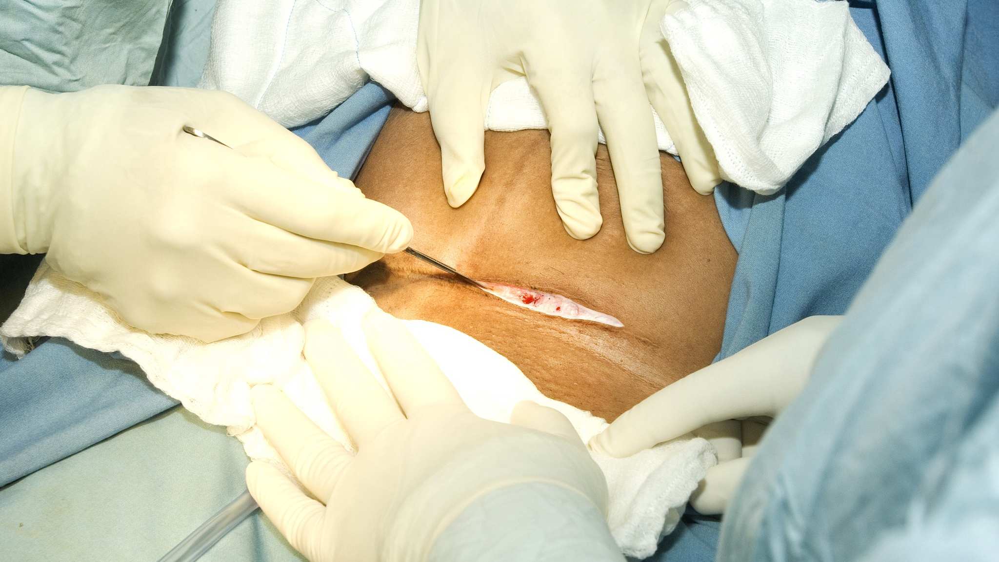 Surgeon using scalpel to make initial incision during Caesarean delivery /VCG Photo