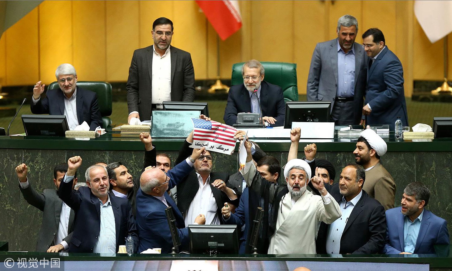 A handout picture provided by the Iranian Parliament on May 9, 2018, shows Iranian MPs preparing to burn a US flag in the parliament in Tehran. /VCG Photo