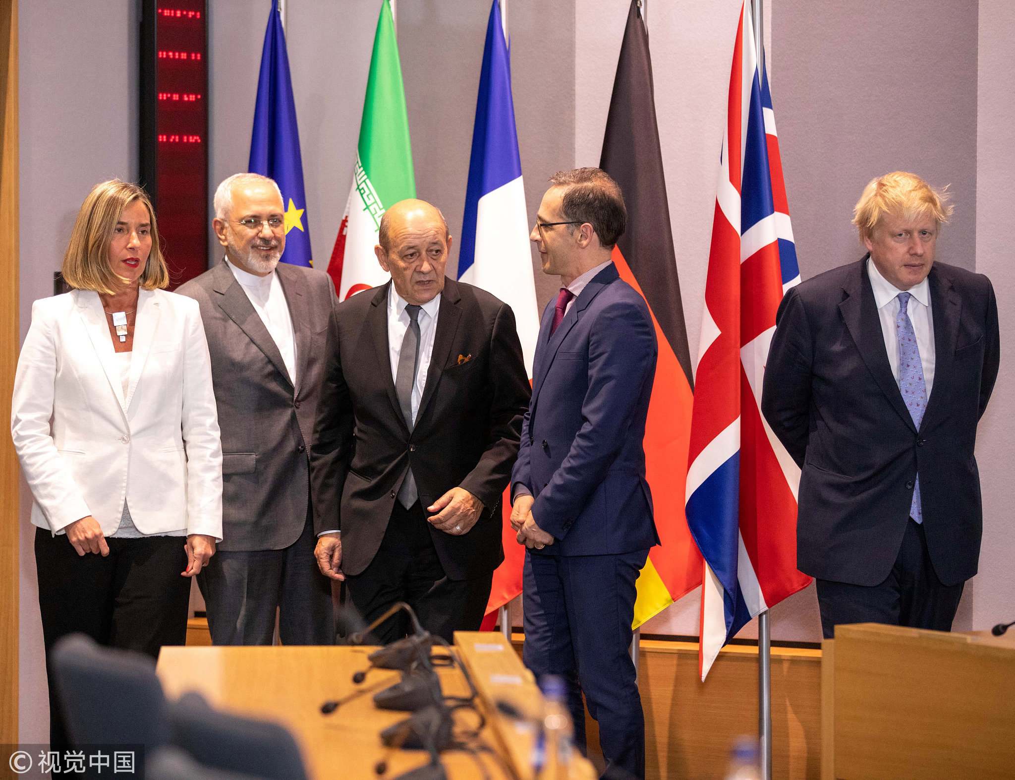 Britain's Foreign Secretary Boris Johnson, German Foreign Minister Heiko Maas, French Foreign Minister Jean-Yves Le Drian and EU High Representative for Foreign Affairs Federica Mogherini take part in meeting with Iran's Foreign Minister Mohammad Javad Zarif in Brussels, Belgium, May 15, 2018. /VCG Photo