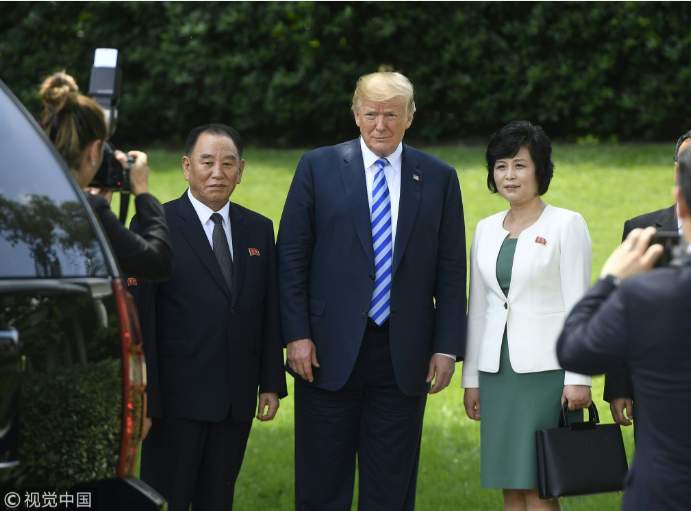 US President Donald Trump (C-R), poses for photographs with senior DPRK official Kim Yong Chol (C-L) at the White House in Washington, DC, June 1, 2018. / VCG Photo