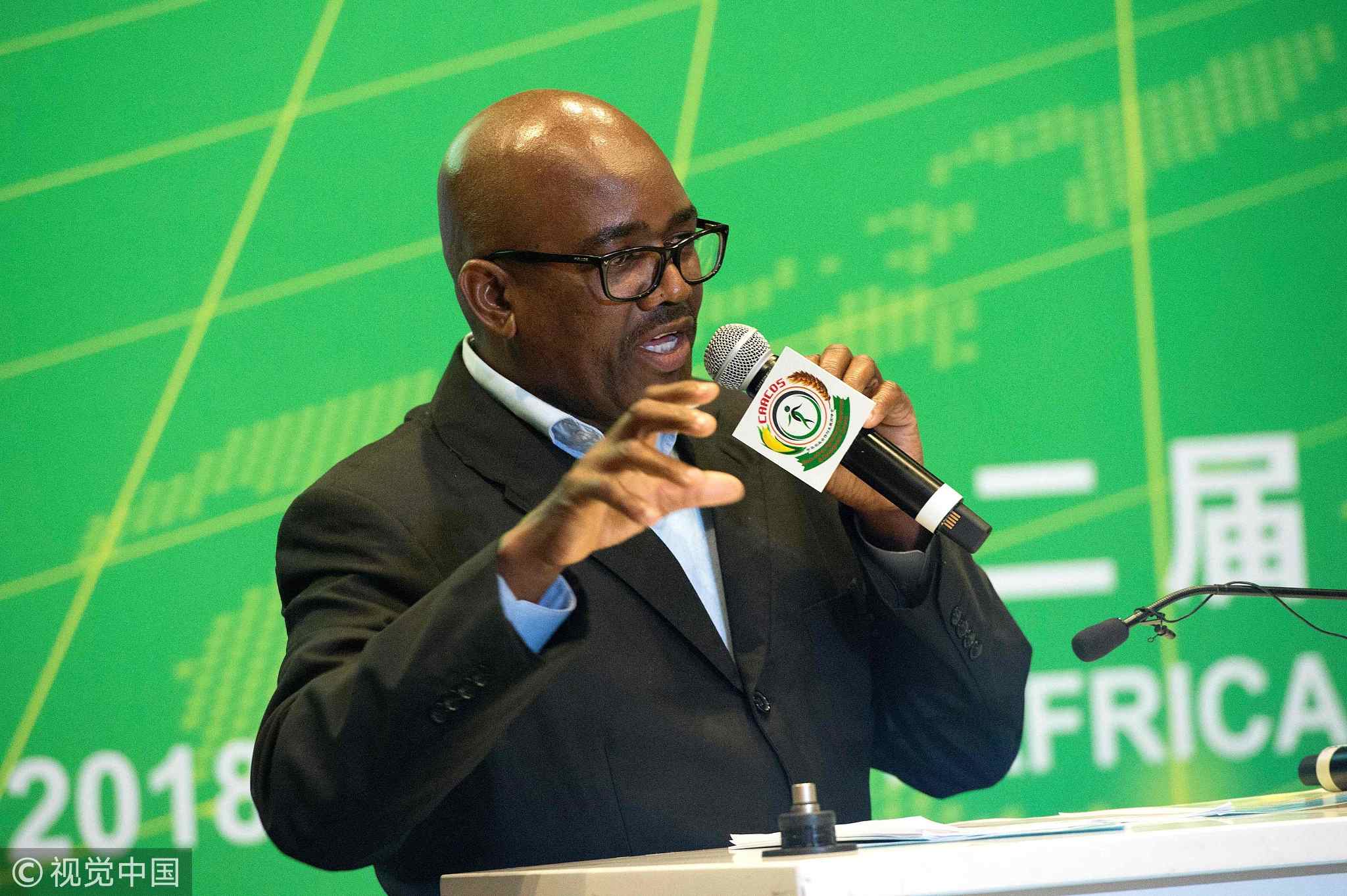 Shammi Budlu, Secretary of the Black Farmers Association of South Africa speaks during the start of the Second China-Africa Agricultural Cooperation & Development Summit in Cape Town on Jul 12, 2018,/VCG Photo
