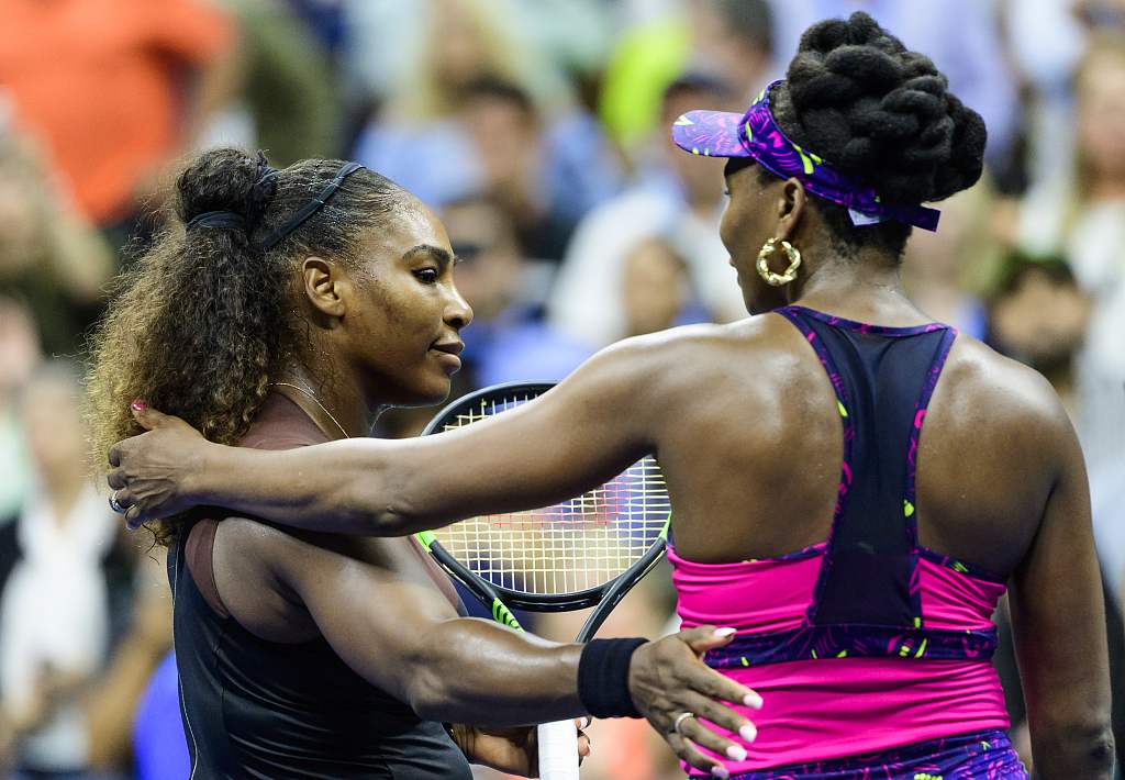 Serena Williams (L) beats sister Venus Williams (R) in the third round of the U.S. Open, August 31, 2018. /VCG Photo