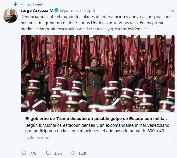 Venezuela's foreign minister denounces US intervention on his Twitter account. /Photo via Twitter