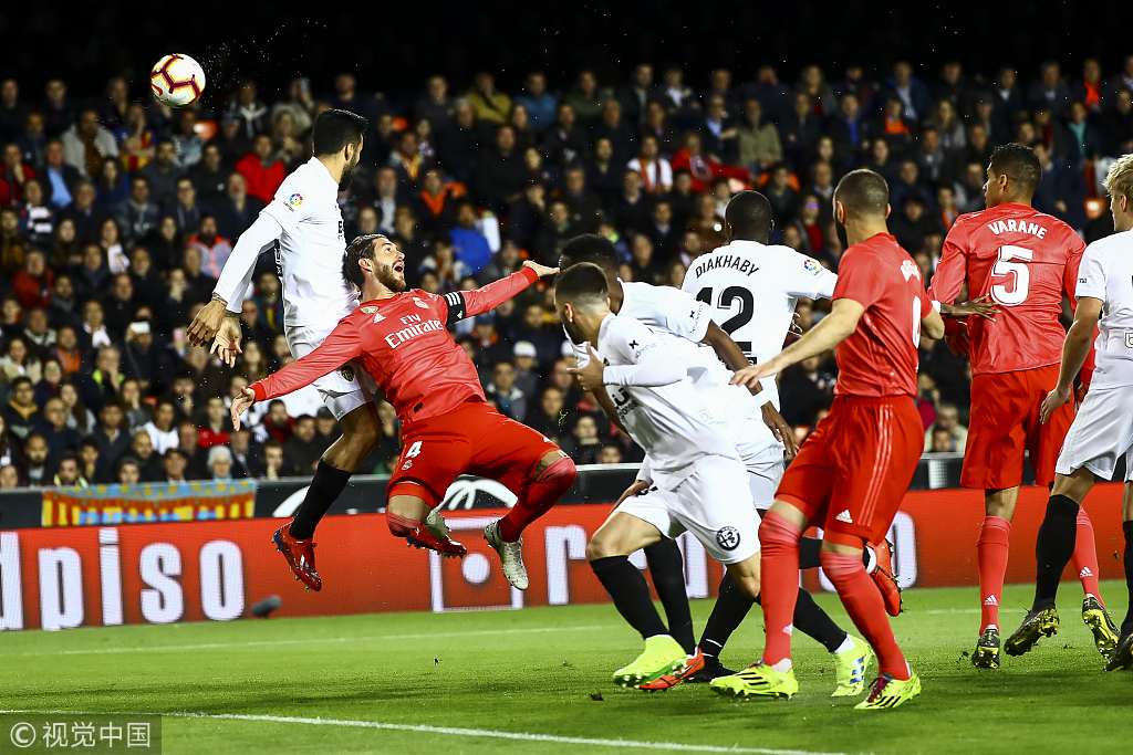 Sergio Ramos (2nd L) of Real Madrid defends the ball during the La Liga match against Valencia CF at Estadio Mestalla in Valencia, Spain, April 3, 2019. /VCG Photo
