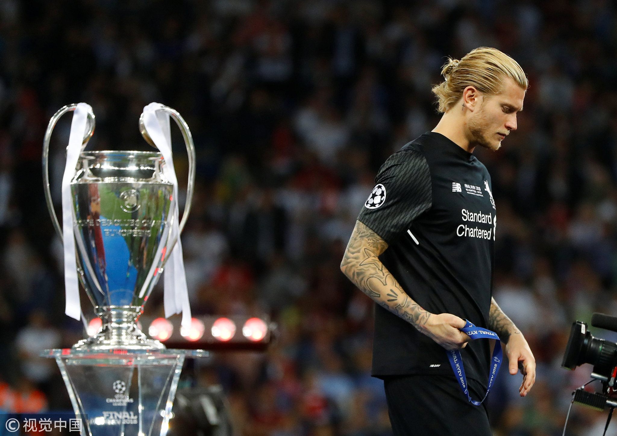 Liverpool's Loris Karius walks past the trophy after the match. /VCG Photo