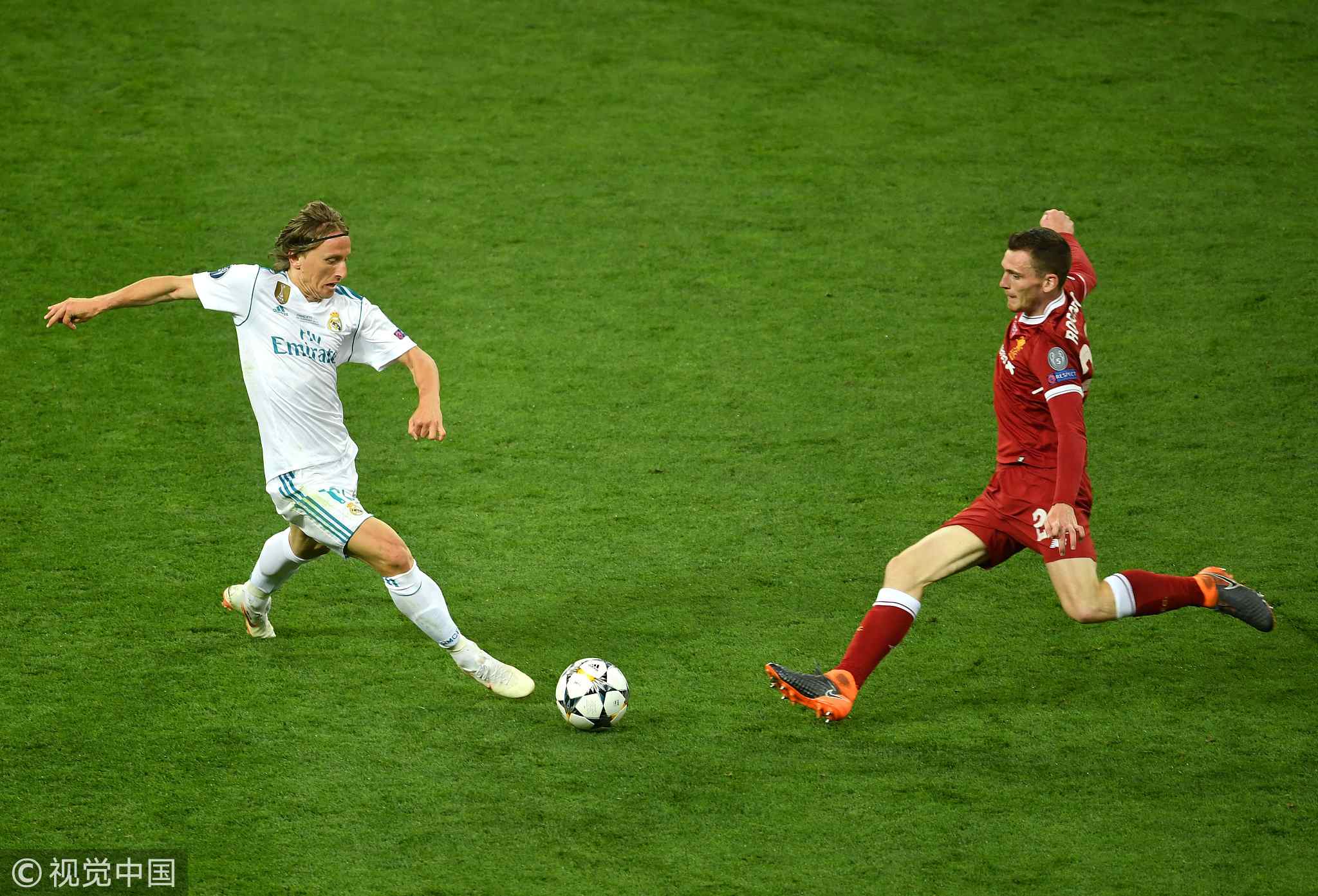 Luka Modric (L) of Real Madrid challenges Andy Robertson (R) of Liverpool during the final. /VCG Photo