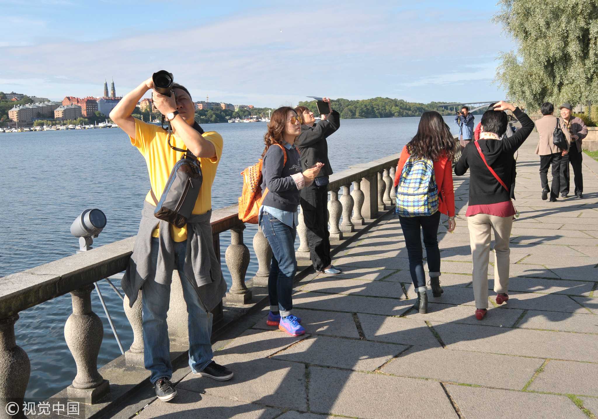 A Chinese tour group from Shanghai take pictures at Stockholm's City Hall, August 31, 2018. /VCG Photo
