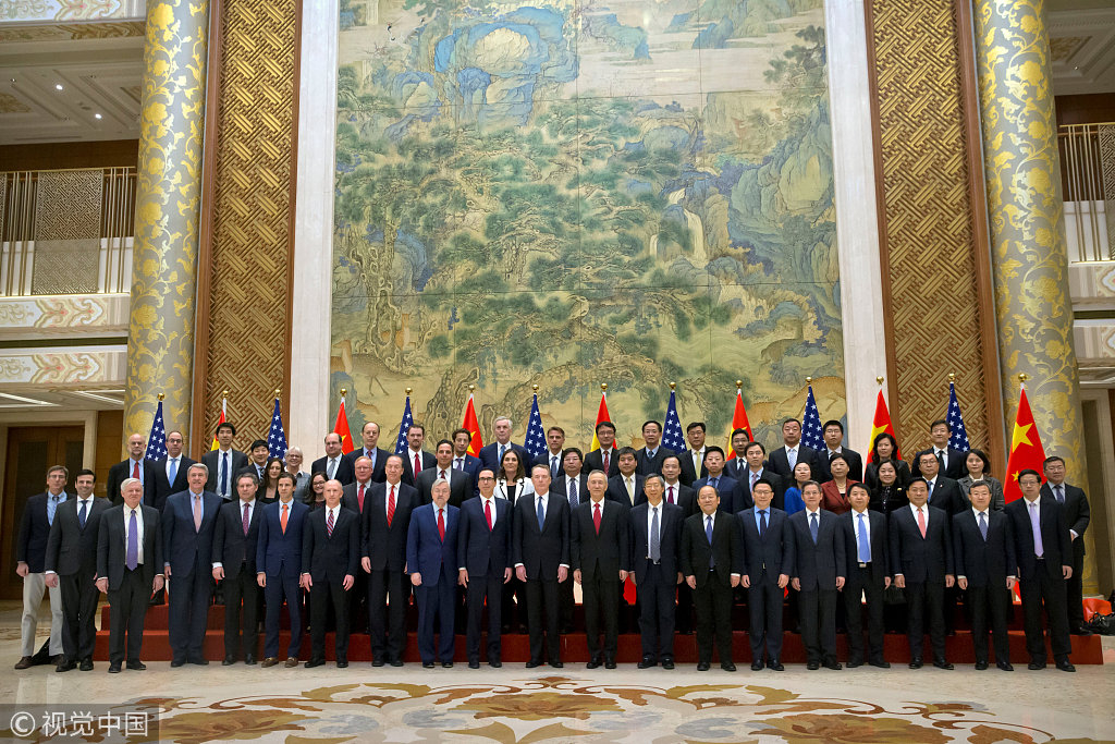 Members of U.S. and Chinese trade negotiation delegations pose for a group photo at the Diaoyutai State Guesthouse in Beijing, China, February 15, 2019. /VCG Photo