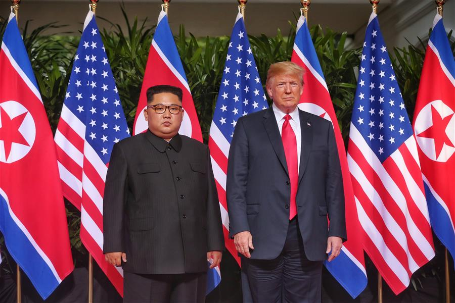 Top leader of the Democratic People's Republic of Korea (DPRK) Kim Jong Un (L) meets with U.S. President Donald Trump in Singapore, June 12, 2018. /Xinhua Photo