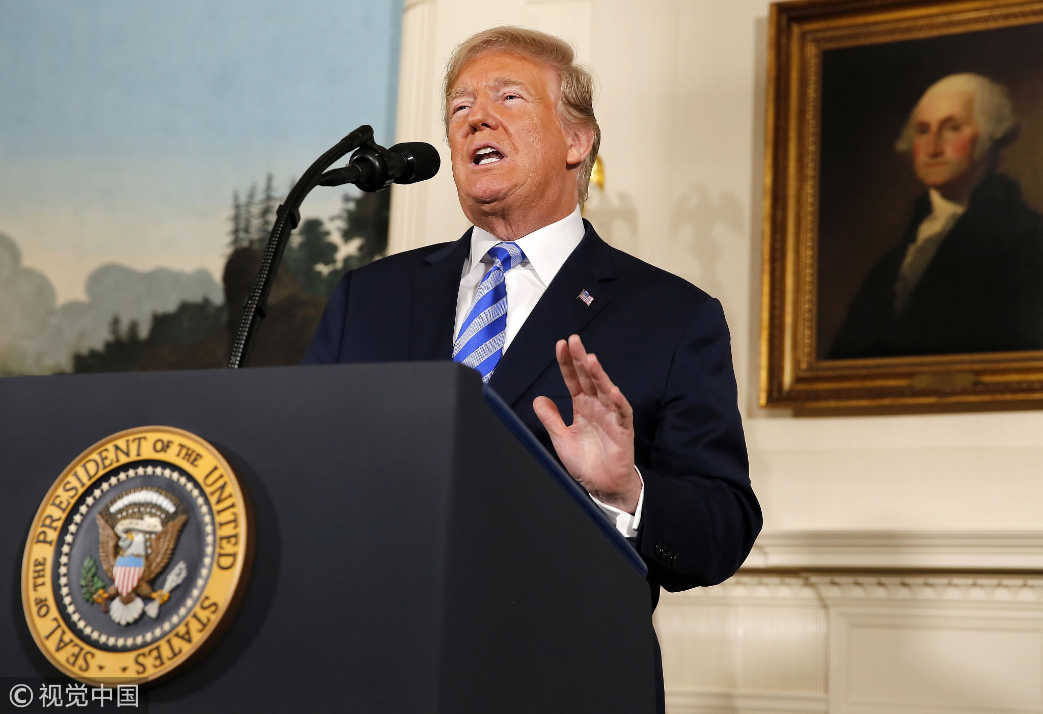 US President Donald Trump makes a statement on the Joint Comprehensive Plan of Action regarding Iran in the Diplomatic Reception Room of the White House in Washington, DC, May 8, 2018. /VCG Photo