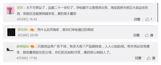 And @malamaosi commented “Is it useful to remove just one single ad? Such products are still on sale. When there is a demand, there is a market. The parents who only want baby boys are disgusting. ”