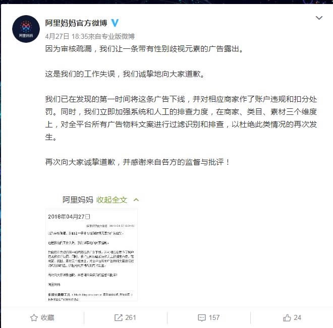 Screenshot of the apology posted on Alimama (a subsidiary of Alibaba) Weibo account