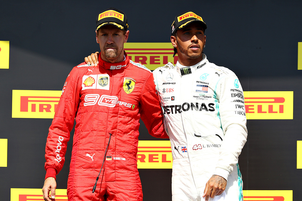 Ferrari's German driver Sebastian Vettel (L) and Mercedes' British racer Lewis Hamilton stand together on the podium of Canada GP in Montreal, June 9, 2019. /VCG Photo