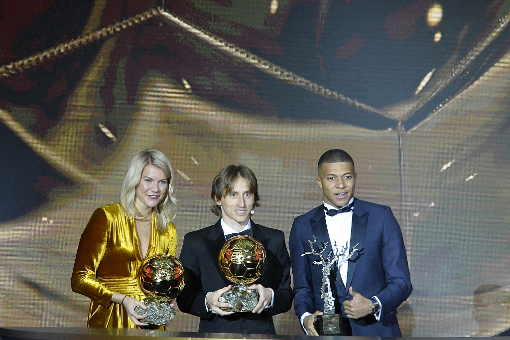Ada Hegerberg (L) of Sweden and Olympique Lyonnais, Luka Modric (C) of Croatia and Real Madrid, and Kylian Mbappe of France and PSG pose with their trophies during the Ballon d'Or ceremony in Paris, France, December 3, 2018. /VCG Photo