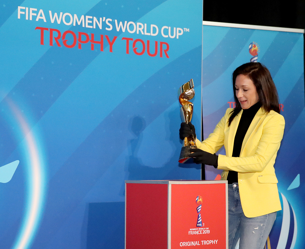 Nadine Kessler places the trophy on the podium during the FIFA Women's World Cup Trophy Tour in Dortmund, Germany, April 14, 2019. /VCG Photo