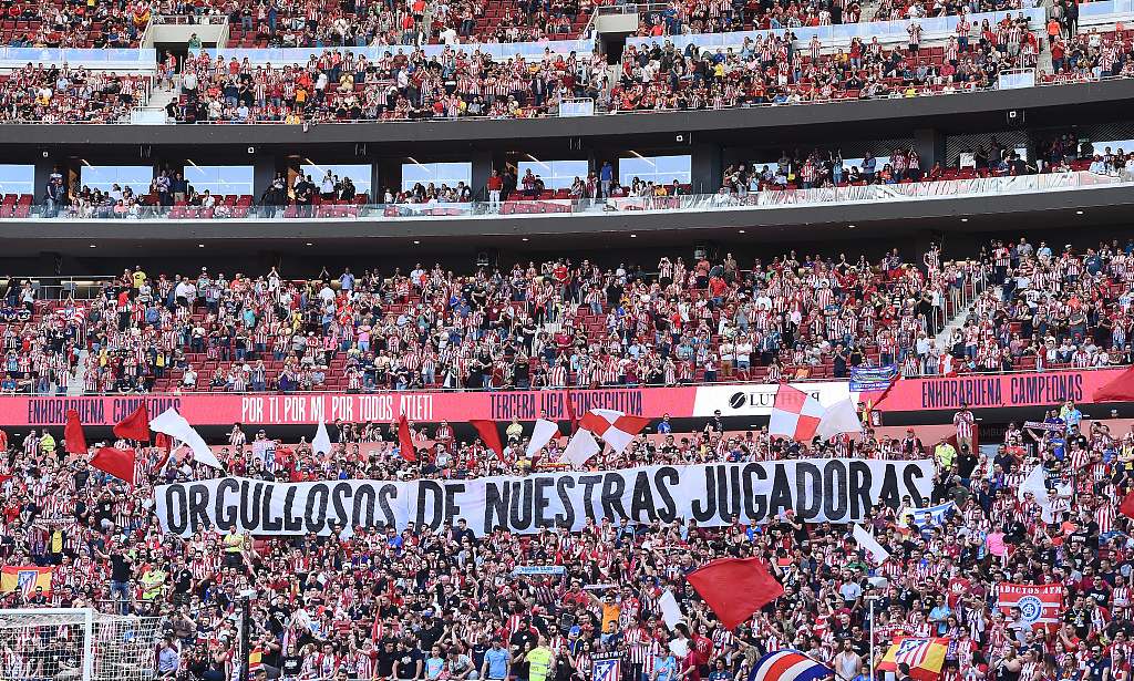 Atletico Madrid fans hold a giant banner that reads 'Proud of our women soccer players' during the La Liga match between Club Atletico de Madrid and Sevilla FC in Madrid, Spain, May 12, 2019. /VCG Photo