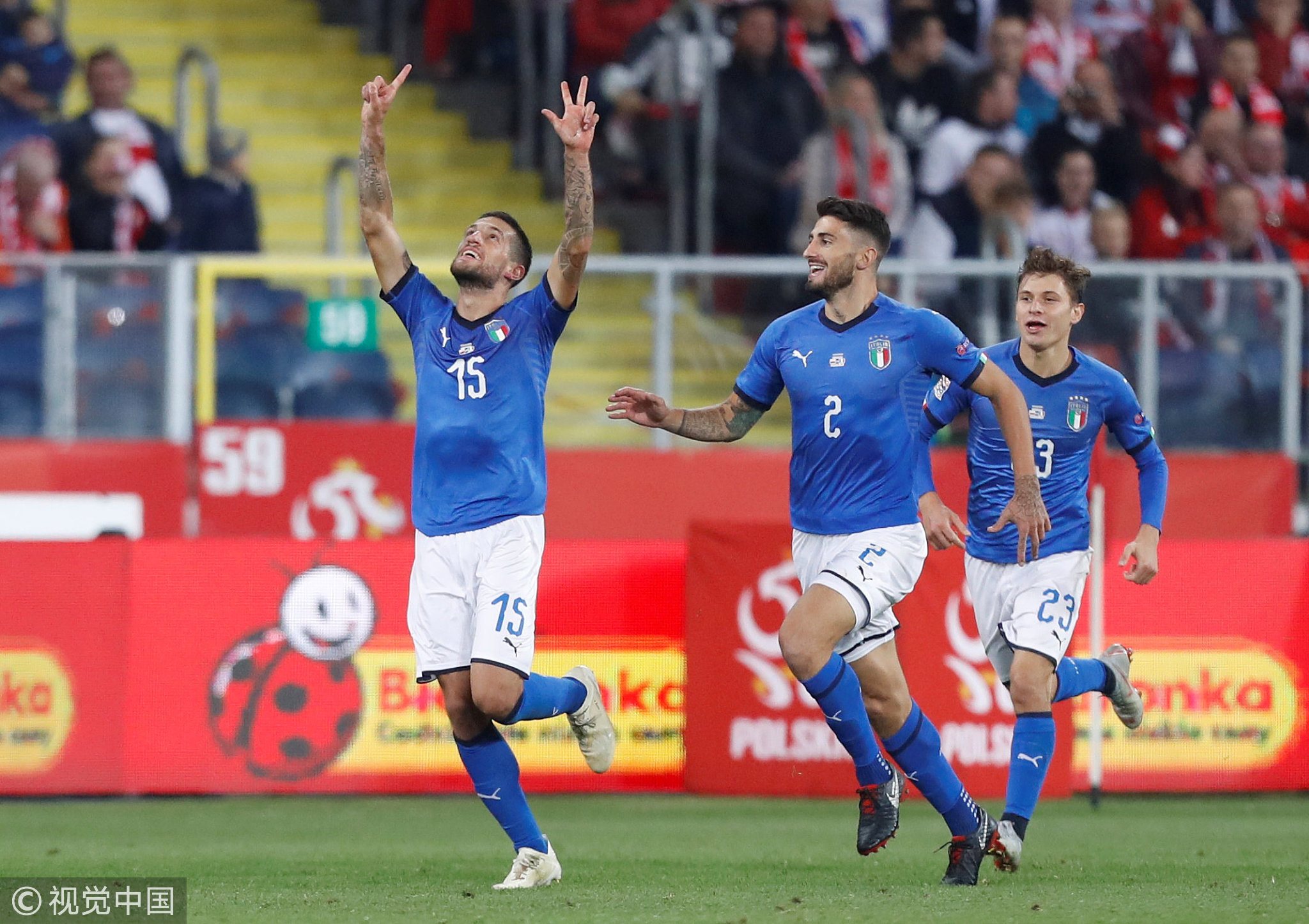 Italy's Cristiano Biraghi (L) celebrates scoring their winning goal with teammates. /VCG Photo