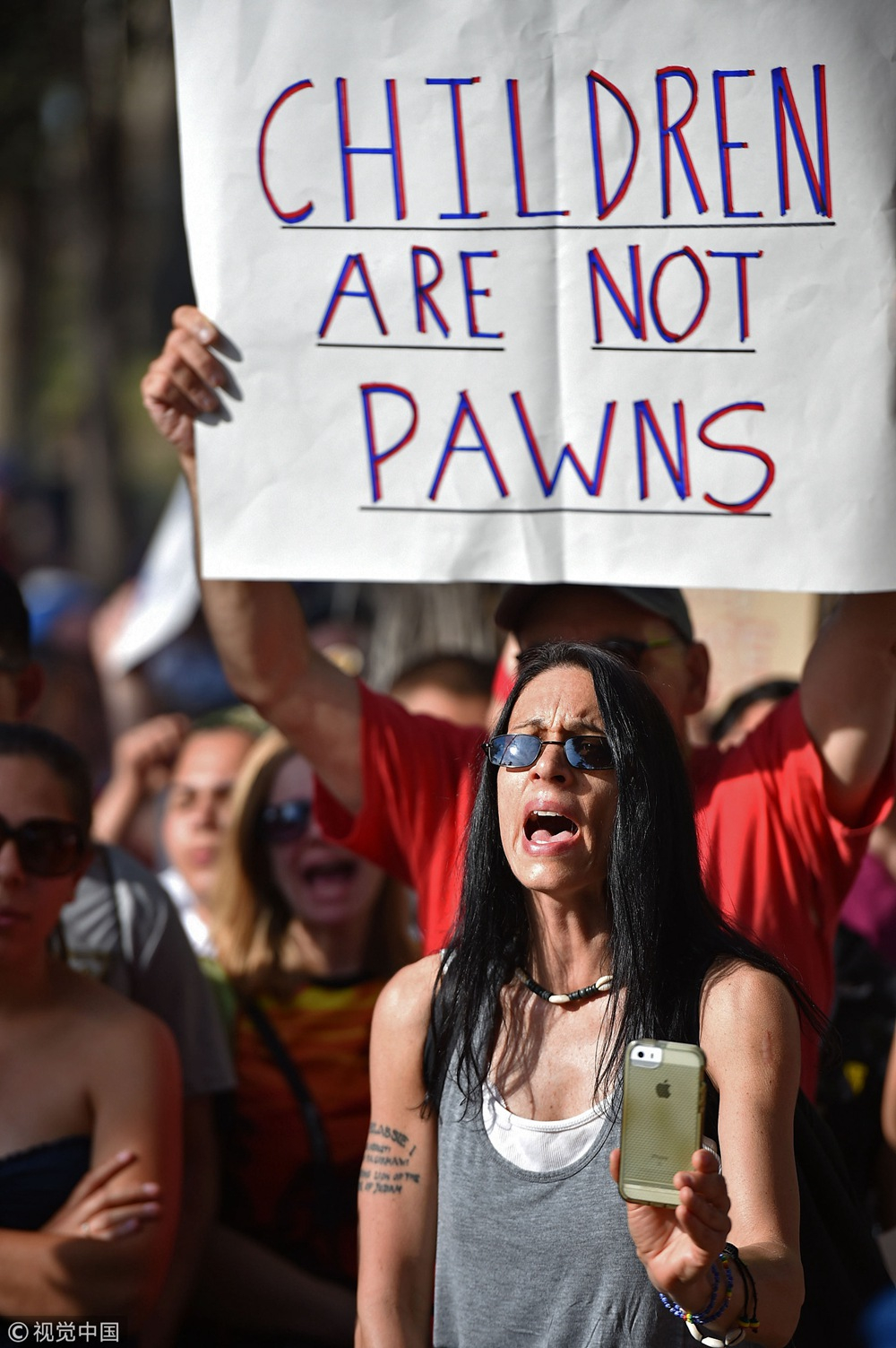 Critics of US government policy which separates children from their parents when they cross the border illegally from Mexico protest during a "Families Belong Together March," in downtown Los Angeles, California, June 14, 2018. /VCG Photo