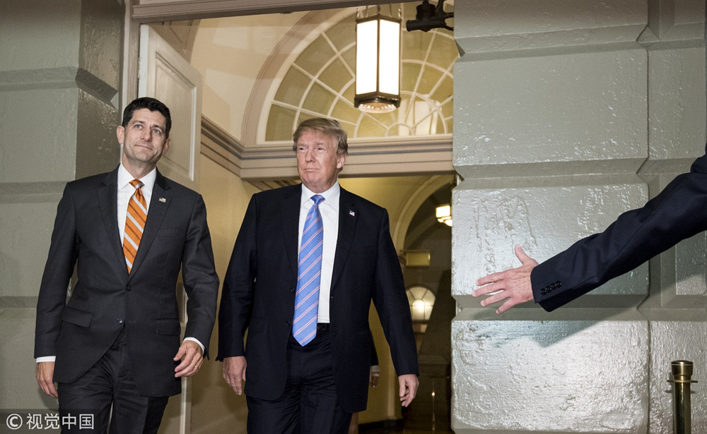 US House Speaker Paul Ryan (L) escorts President Donald Trump to the House Republican caucus meeting in Washington, DC, June 19, 2018. /VCG Photo