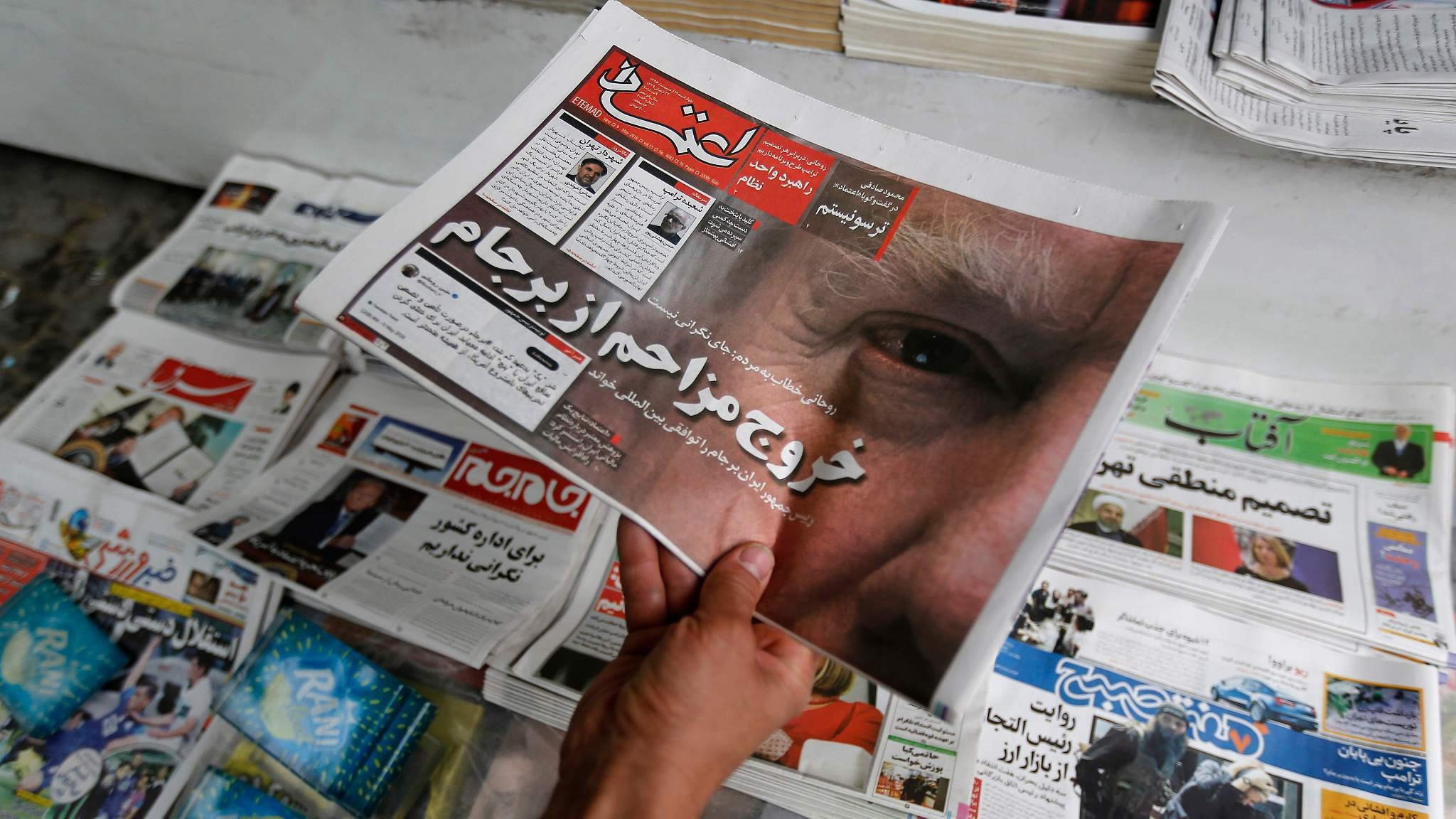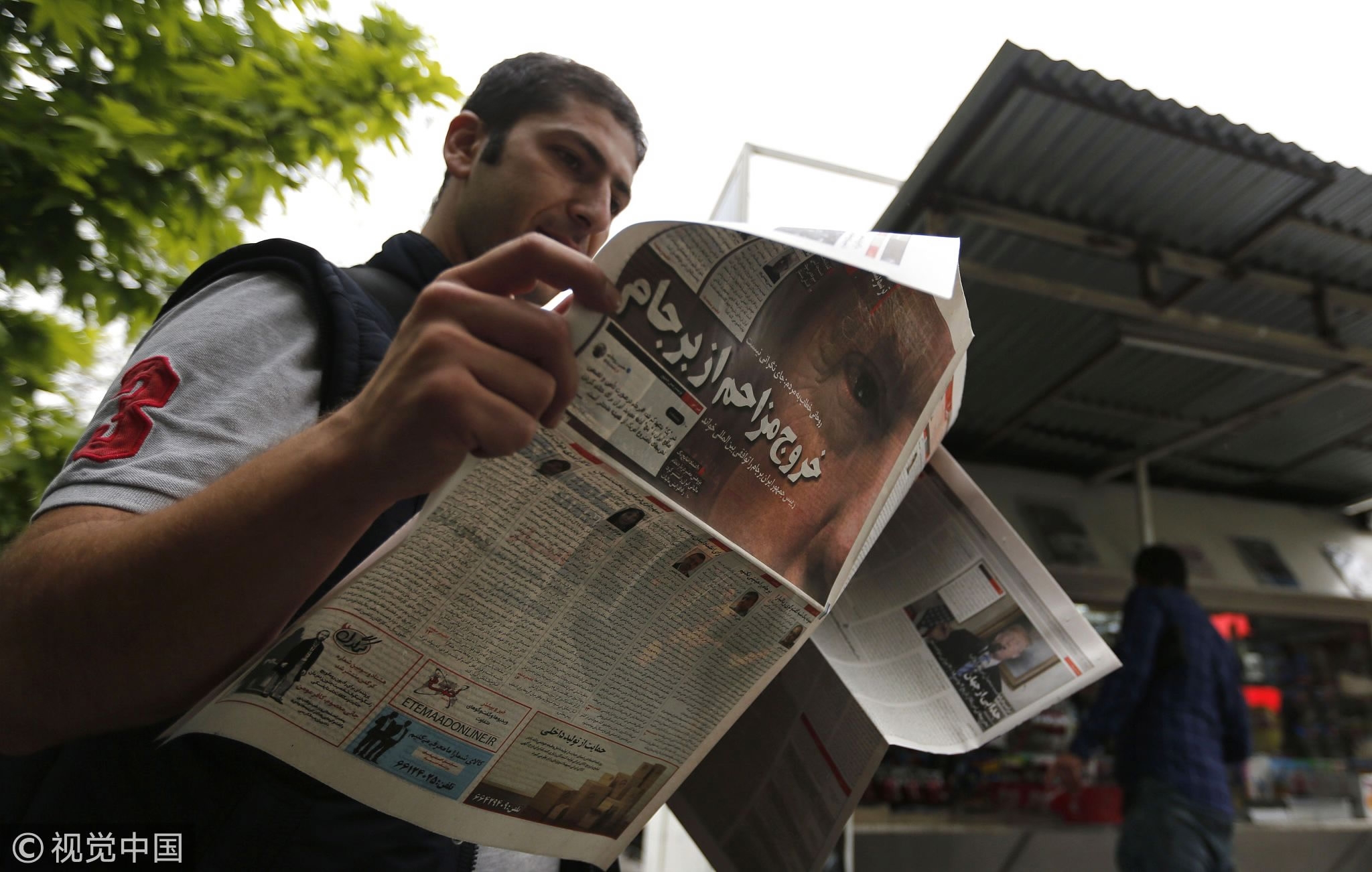 An Iranian man checks a newspaper in Tehran on May 9, 2018 a day after US President Donald Trump (portrait) announced the US is pulling out of the nuclear deal. /VCG Photo