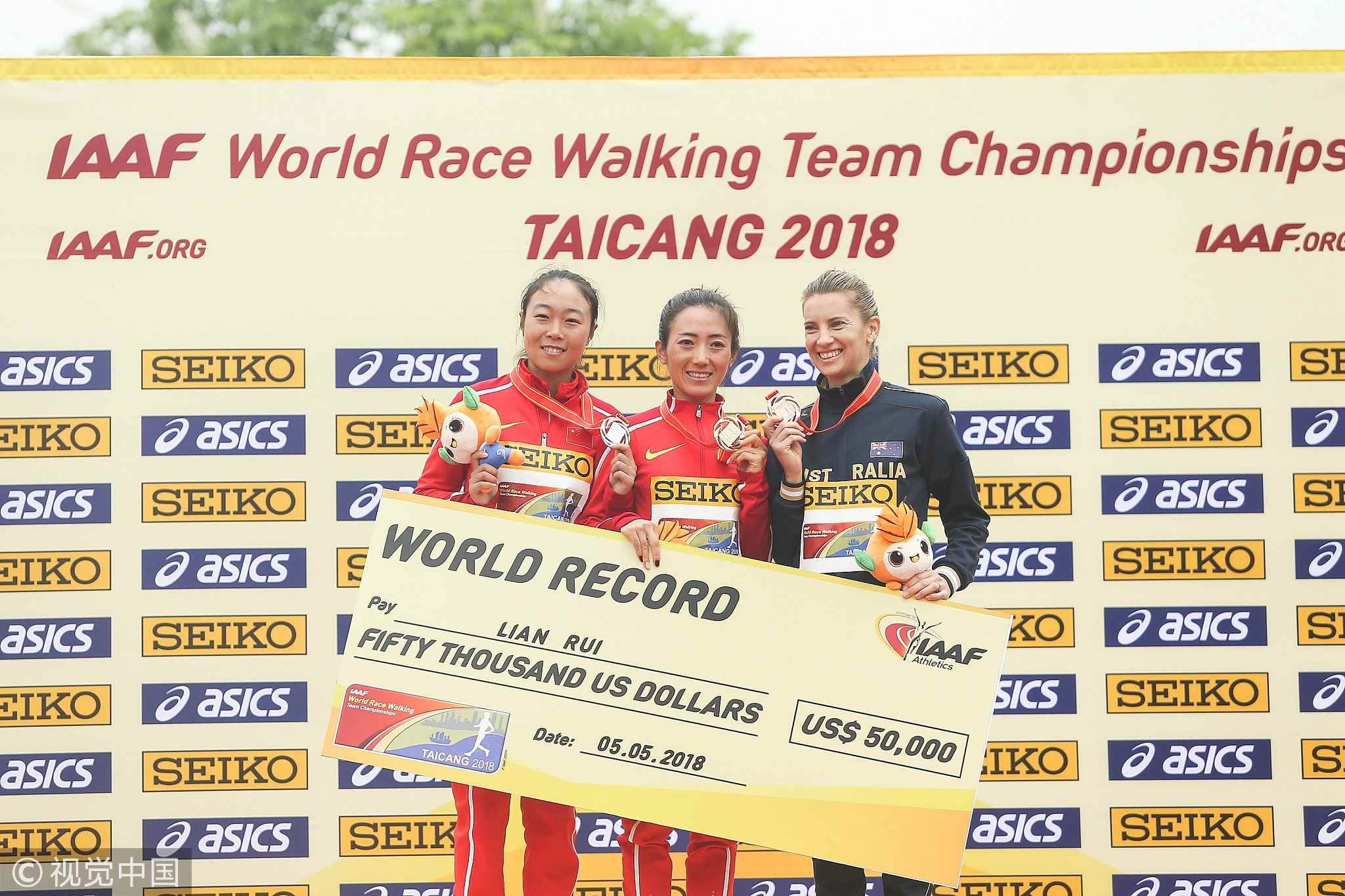Runner-up Yin Hang of China (1st L), winner Liang Rui of China (2nd L) and third placer Claire Tallent of Australia pose for photo for the women's 50km event at IAAF World Race Walking Team Championships in Taicang, east China, on May 5, 2018. /VCG Photo