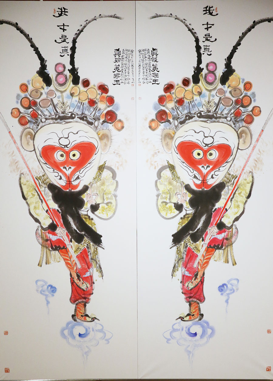 The exhibits include massive figure paintings shows his experiments in reinterpreting some of the mythical household names in China, such as Guan Yu as an upright, royal general living in the late second century to the early third century, to Sun Wukong, the Monkey King, from Journey to the West.