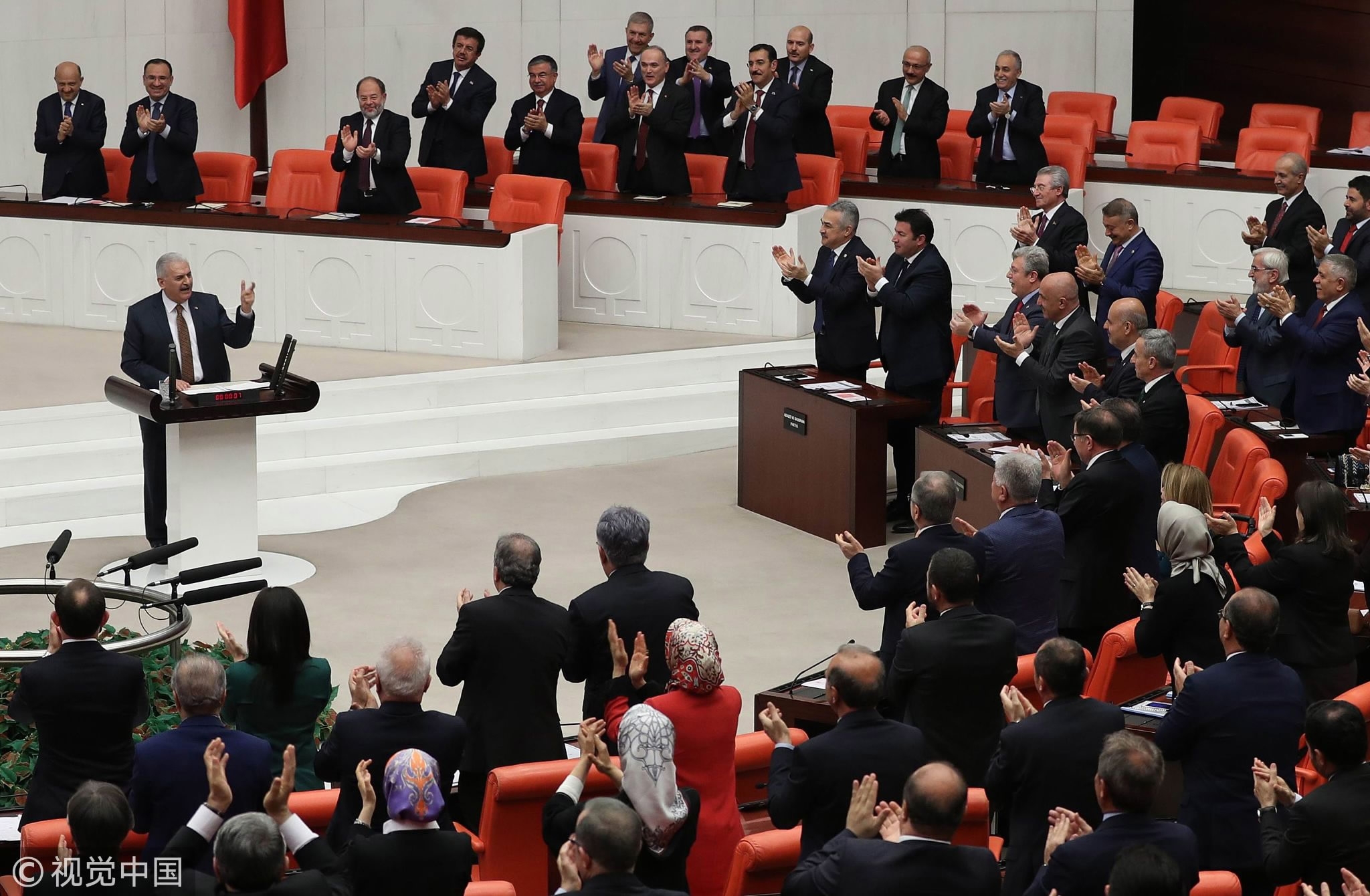 Members of Parliament applaud as Turkish Prime Minister Binali Yildirim (L) speaks during the debate motion on proposed early presidential and parliamentary elections, April 20, 2018, at the Grand National Assembly of Turkey (TBMM) in Ankara. /VCG Photo