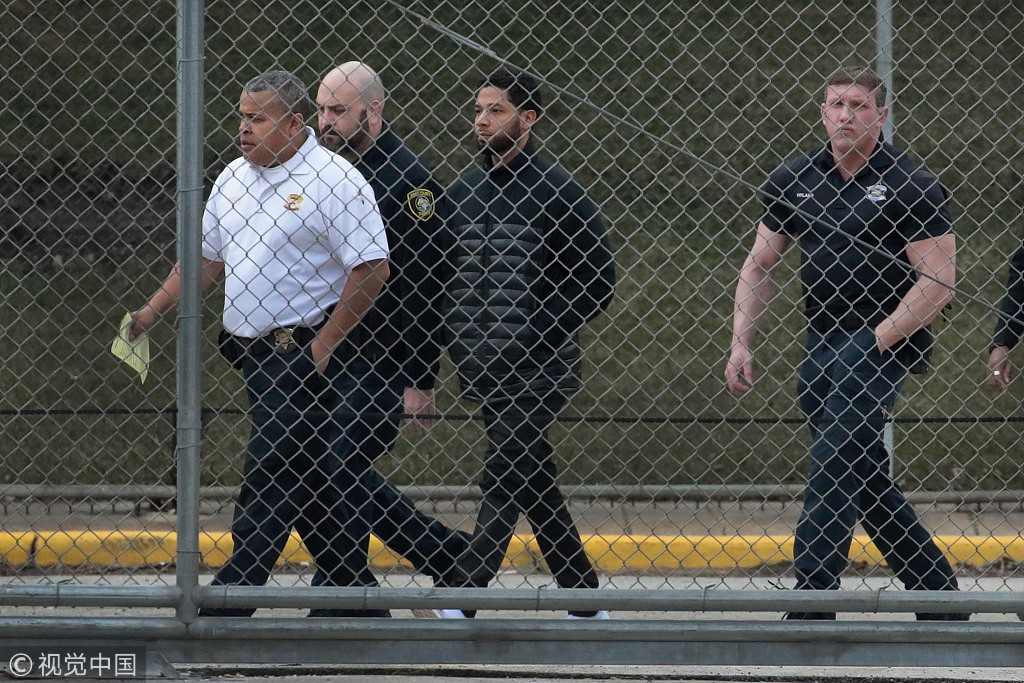 Guards walk with "Empire" actor Jussie Smollett before he is released on bond from Cook County jail in Chicago, Illinois, February 21, 2019. /VCG Photo